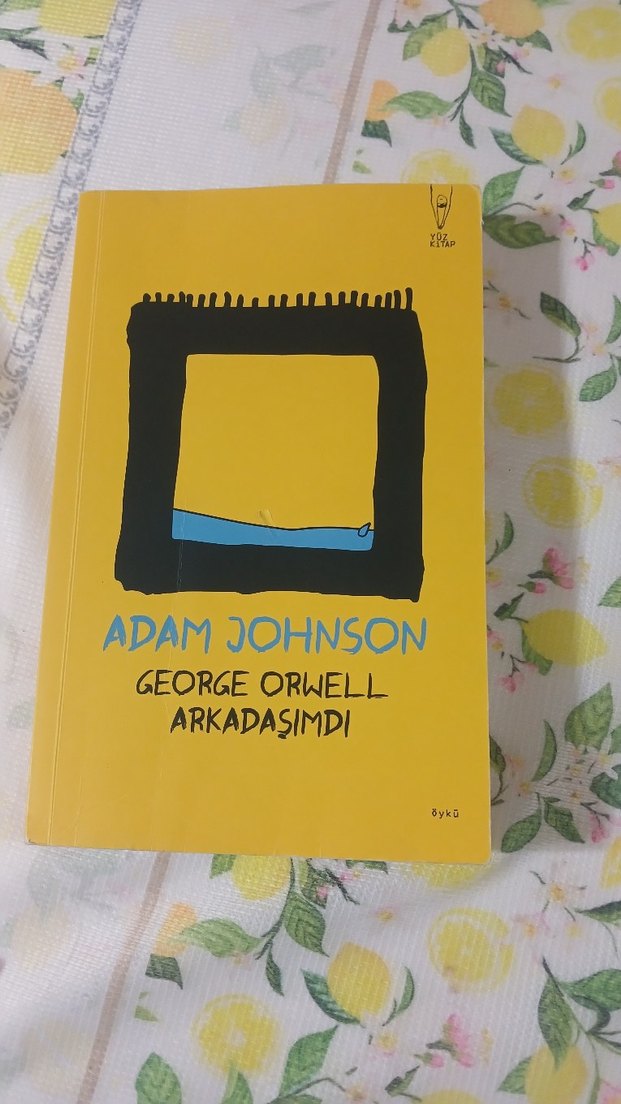 Adam Johnson'un "George Orwell Arkadaşımdı" adlı romanı, siyah ve mavi soyut bir tasarıma sahip sarı kapaklı özgün bir anlatımı içeriyor. kapağında küçük bir çizik var dikkatli bakılırsa görürüz