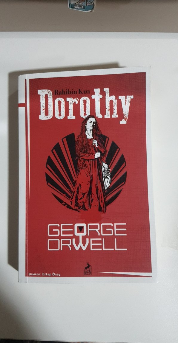 George Orwell'in "Dorothy" romanı, uzun elbiseli bir kadının çizimiyle kırmızı kapaklıdır. Çevirmen: Ertap Onay.