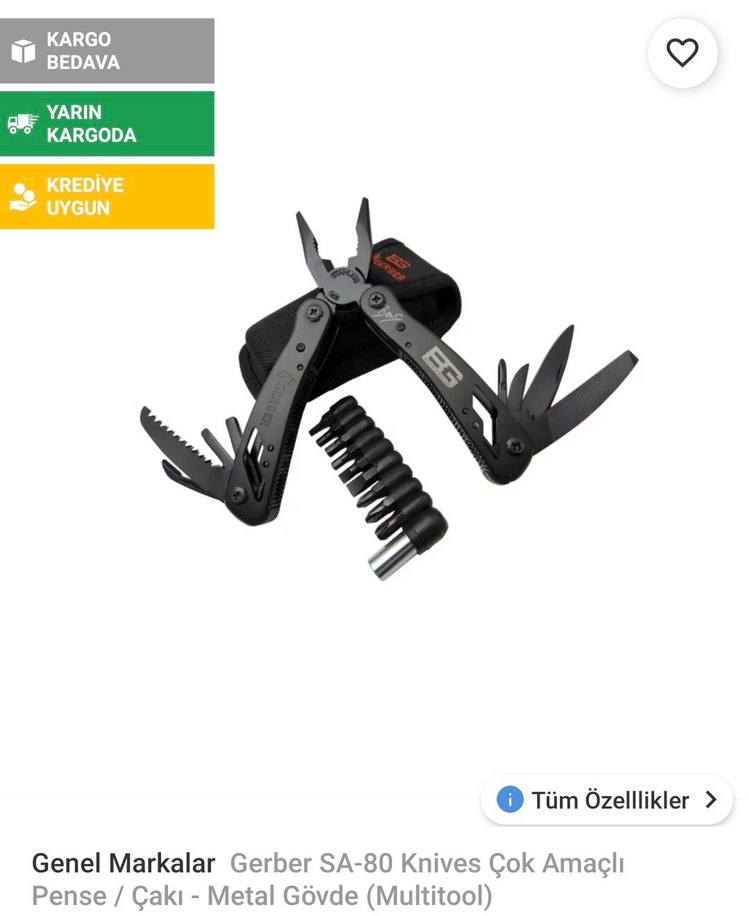 Gerber SA-80 çok amaçlı multitool, metal gövde ve pense, bıçak, tornavida gibi çeşitli aletler içerir. Bit seti ve taşıma kılıfı dahildir. Siyah renk. ️