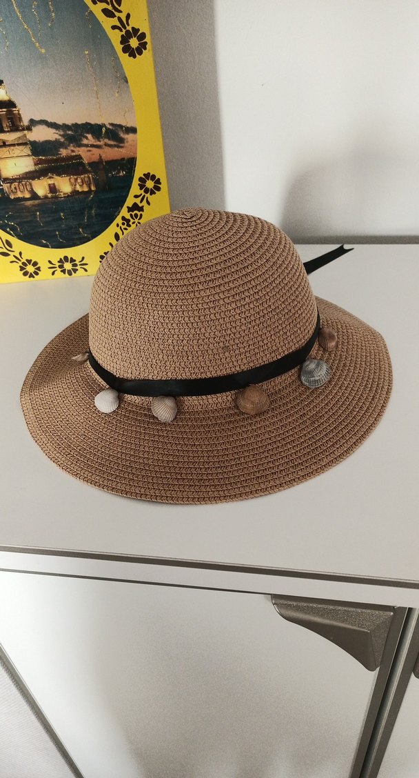 Bej renkte, örgü kumaştan yapılmış bohem tarzda kadın şapkasının siyah bandında boncuklu deniz kabukları yer alır, retro ve hippie havası katar.