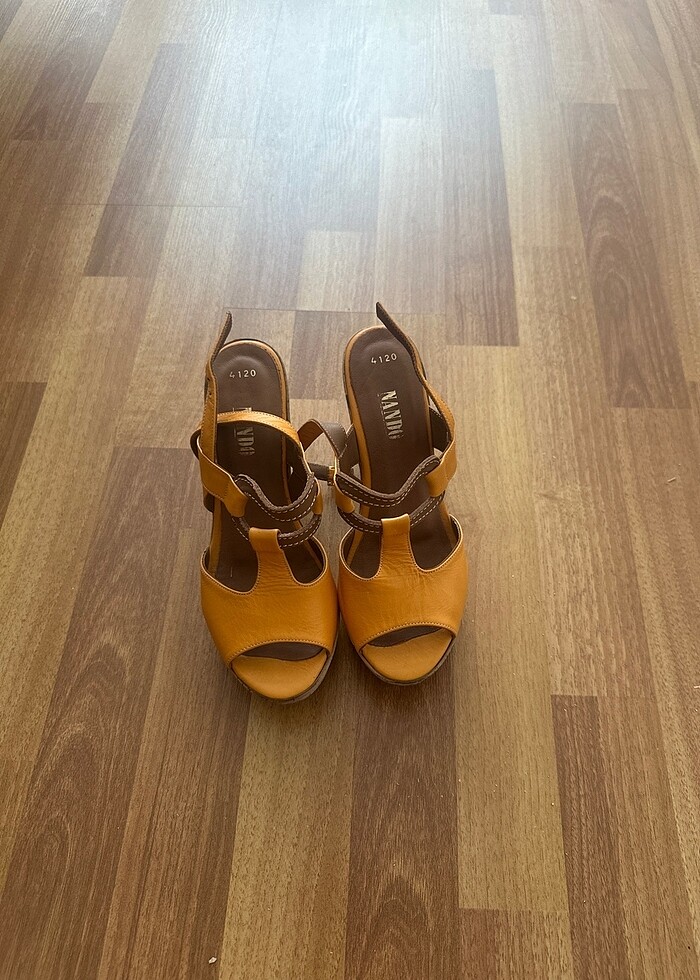 Oldukça kaliteli ve hafiftir. Topuk boyu 11.5 / önde platformu var. Turuncu ve kahve renklerinde. Mantar topuk.