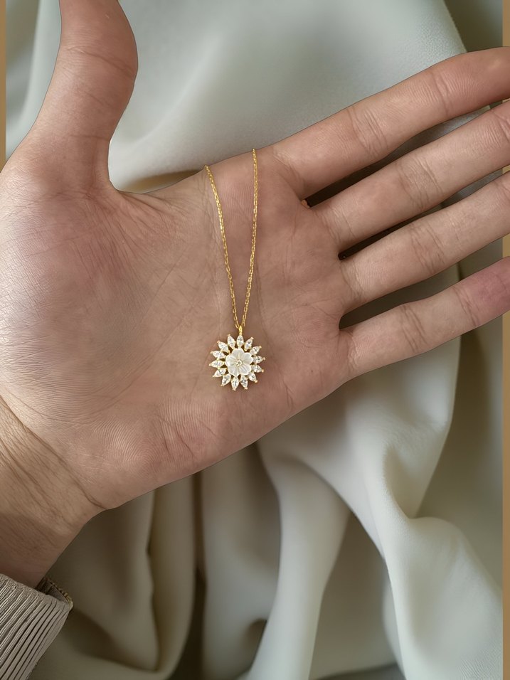 Gerçek Gümüş Gold Çiçek Kolye (925 Ayar)
