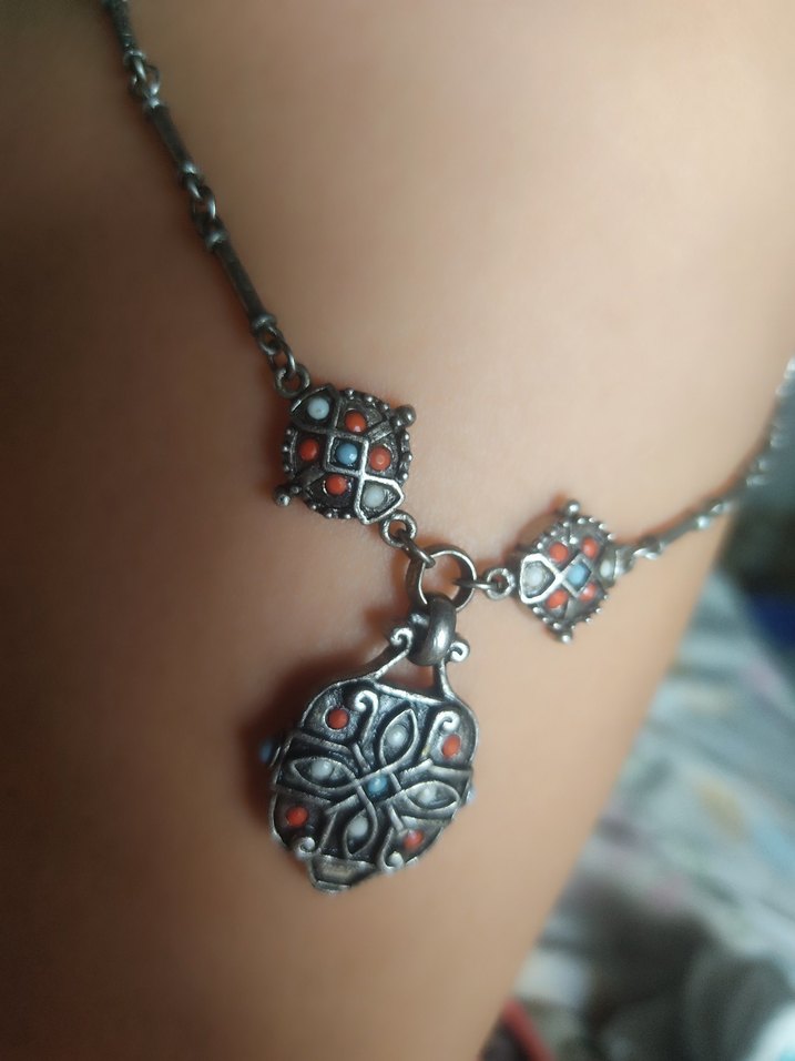 Turkuaz ve mercan etnik desenlere sahip, detaylı zincirli uzun bohem tarzda günlük kullanıma uygun gümüş kolye #gümüs #kolye
