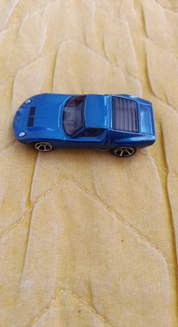 Parlak mavi renkte, detaylı tasarıma sahip oyuncak araba, siyah tekerleklerle donatılmıştır.