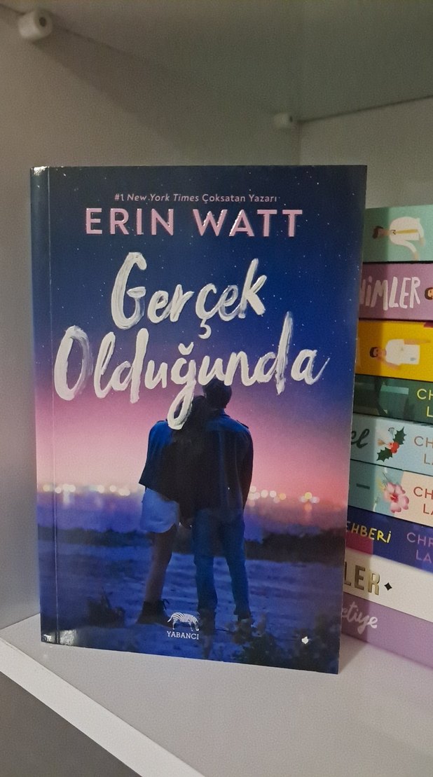 Erin Watt tarafından yazılan "Gerçek Olduğunda" romanı, yıldızlı bir gökyüzü altında duran iki kişiyi gösteren kapak tasarımına sahiptir. #1 New York Times çok satan yazarıdır.