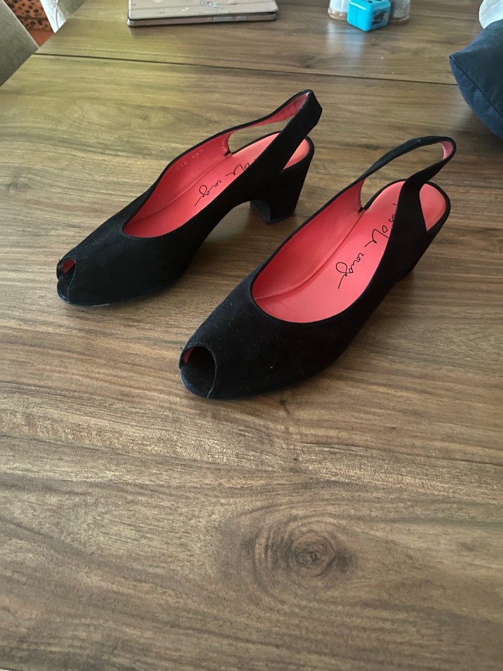 Siyah, topuklu, açık burunlu kadın akşam ayakkabısı. Kauçuk malzemeden, romantik akşamlar için zahmetsiz şıklık sunar. 38 ve 38,5 uygun 1 kez giyildi yepyeni