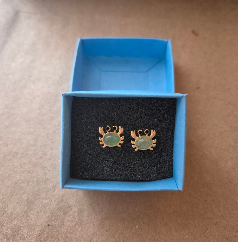 Turkuaz taşlı, mini yengeç figürlü kısa boy küpeler, klasik ve minimal stili tamamlar. Gerçek yeşim taşı.