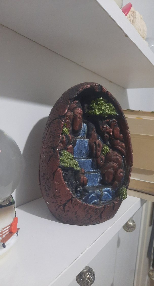 Kahverengi figürin, mavi şelale ve yeşil bitkilerle doğal bir manzarayı yansıtıyor.
