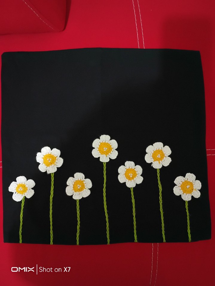 40/40 ölçülerinde motitif işlemeli geri dönüşüm kırlent kılıfı alt kısmında beyaz işlemeli çiçekler bulunur.