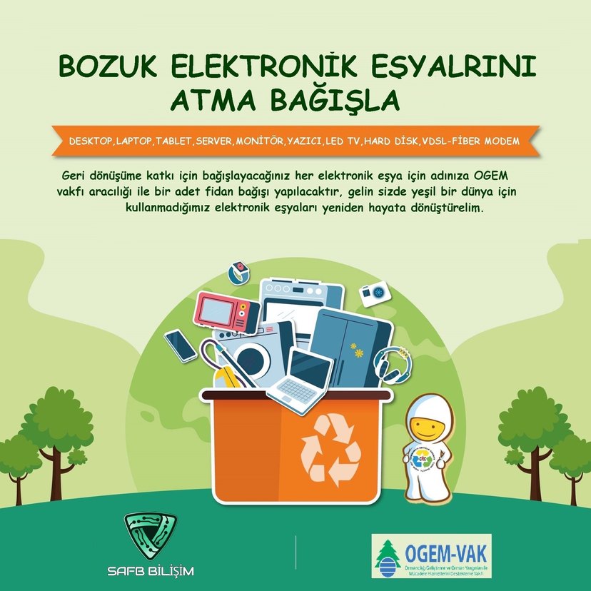 Kullanmadığınız elektronik eşyaları OGEM-VAK ve SAFB Bilişim aracılığıyla bağışlayın. Her bağış için bir adet fidan dikimi yapılacak, yeşil bir dünya için katkı sağlayın.
