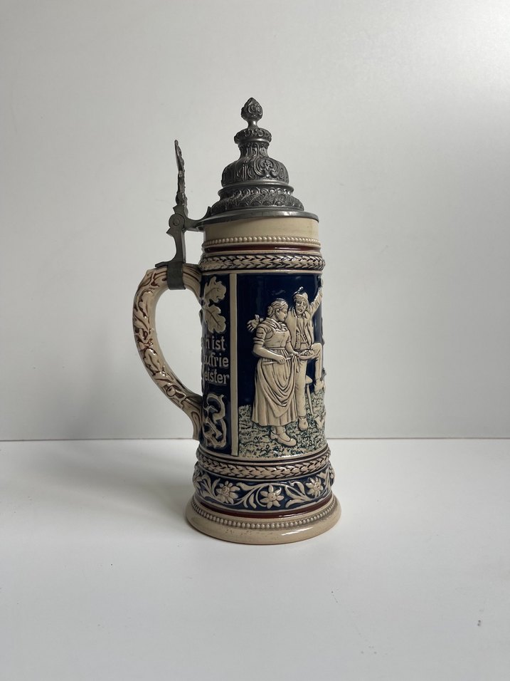 Germany Seramik Kabartma Dekorlu Zinn Kapaklı Kusursuz tankard