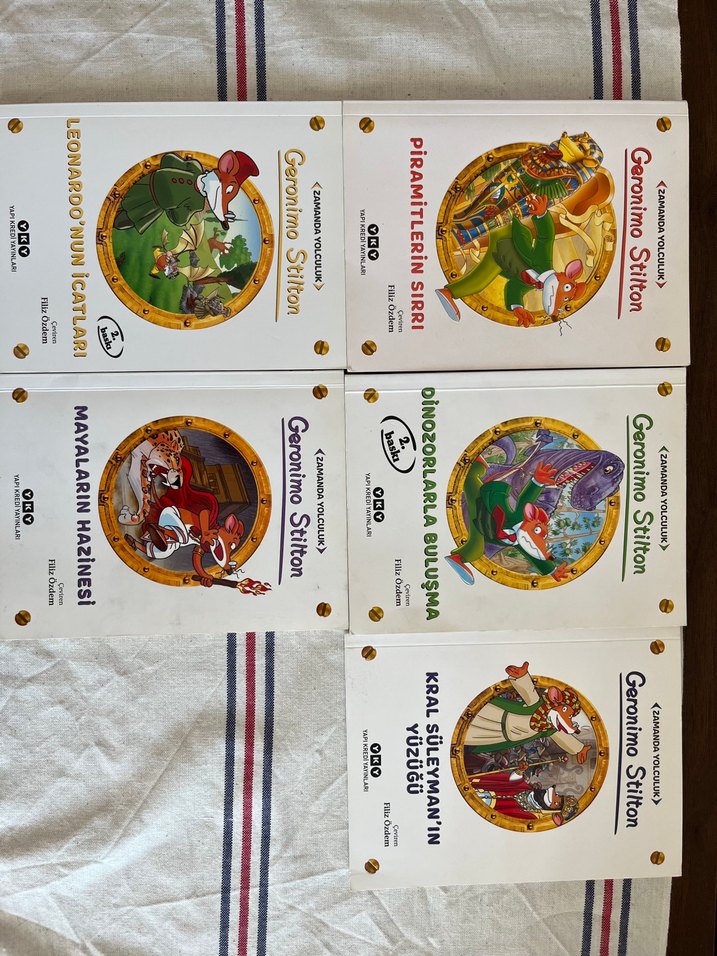 Geronimo Stilton çocuk kitapları seti; Mayaların Hazinesi, Dinozorlarla Buluşma, Leonardo'nun İcatları, Piramitlerin Sırrı ve Kral Süleyman'ın Yüzü gibi kitaplar içerir.