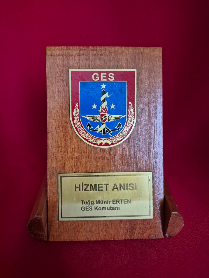 GES KOMUTANLIĞI PLAKET..9.5x12.5 cm boyutunda Türk askeri istihbaratının "kara kutusu" olarak bilinen ve 2012 yılında Milli İstihbarat Teşkilatı'na (MİT) devredilen GENELKURMAY ELEKTRONİK SİSTEMLER KOMUTANLIĞI'na ait çok nadir bir hizmet anısı şiltidir. Ahşap kaide üzerine monte edilmiş, GES Komutanlığı'nın ikonik amblemini (yıldızlar, kılıç, şimşek ve çıpa figürleri) içeren metal plaka. Kondisyonu oldukça iyi durumdadır; yazı ve logolarda silinme yoktur. GES Komutanlığı artık TSK bünyesinde bu isimle var olmadığı için, birimin tarihsel kimliğini yansıtan sınırlı sayıdaki hatıra objelerinden biridir. Askeri tarih meraklıları ve istihbarat koleksiyoncuları için eşsiz bir parçadır.
