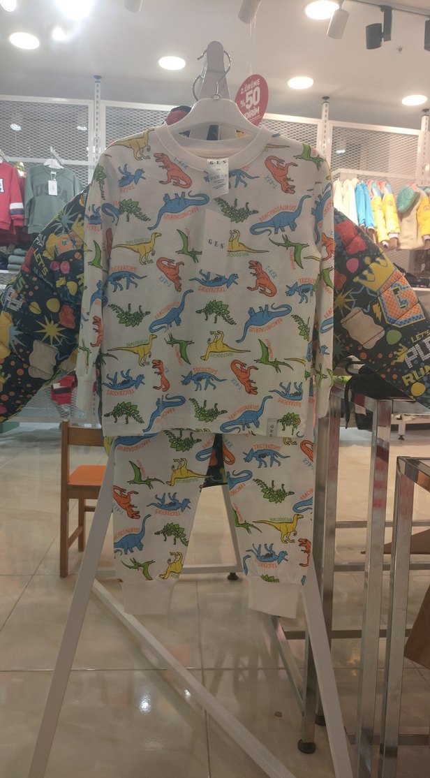 Renkli, uzun kollu ve rahat kesim erkek çocuk pijama takımı. Üzerinde eğlenceli dinozor baskıları bulunur. 4-5 Yaş