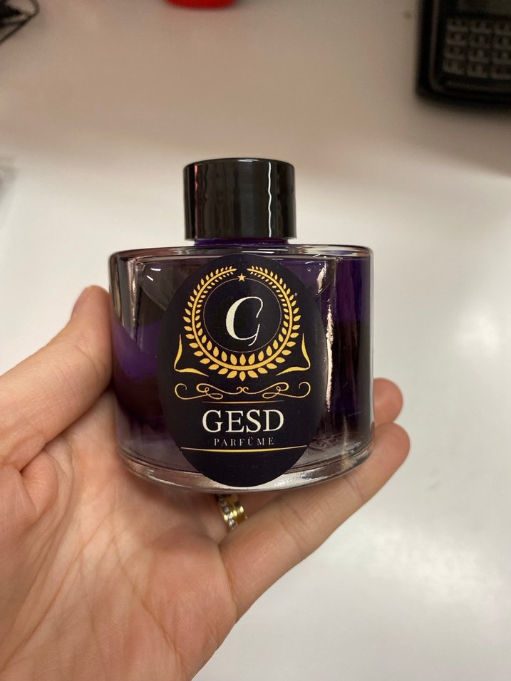 Siyah kapaklı, koyu mor şişede GESD oda kokusu Yuvarlak şişe ve siyah-altın etiket tasarımı ile öne çıkar . Pudra kokusudur