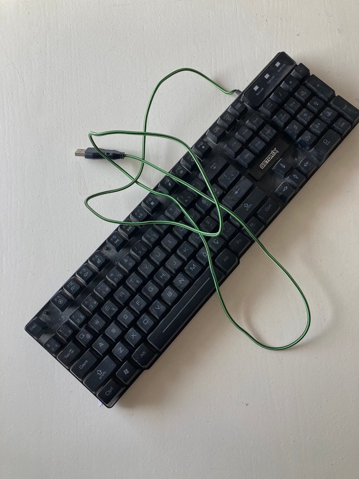Koyu yeşil kablosu ve siyah tuşları olan, standart düzenli kablolu klavye. Arka ayaklığın biri kayboldu görselde gösterdiğim gibidir.