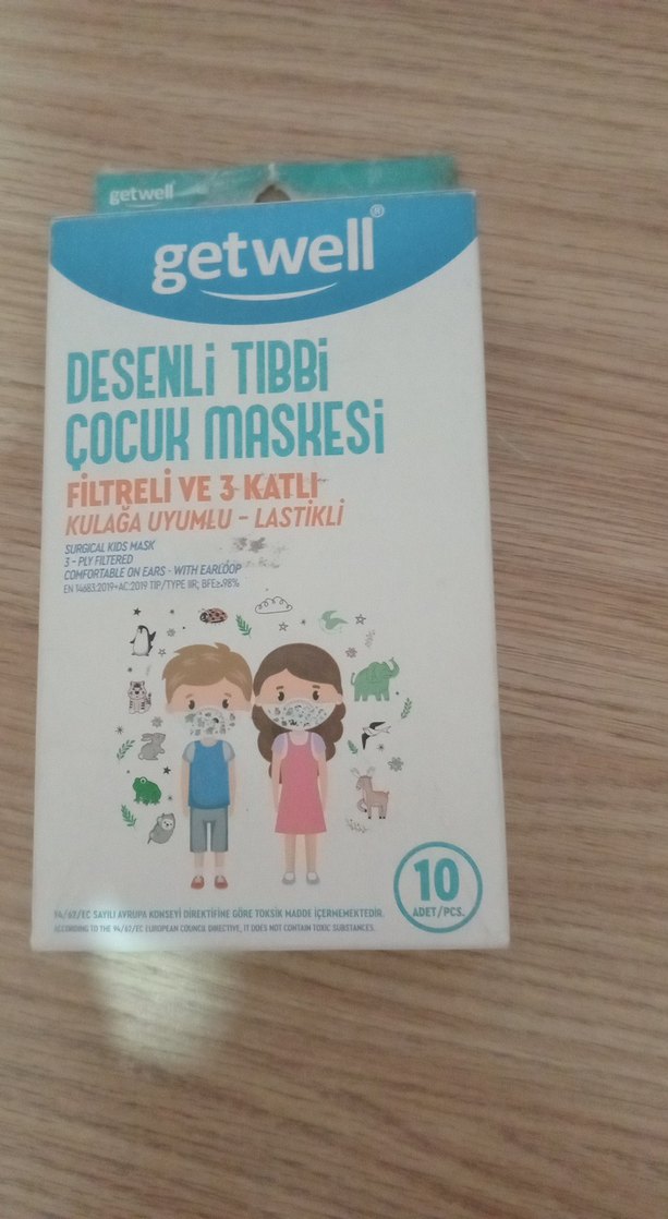 Getwell desenli tıbbi çocuk maskeleri, 3 katlı filtreli, kulak uyumlu lastikli, 10 adet içerir. Konforlu kullanım sağlar.