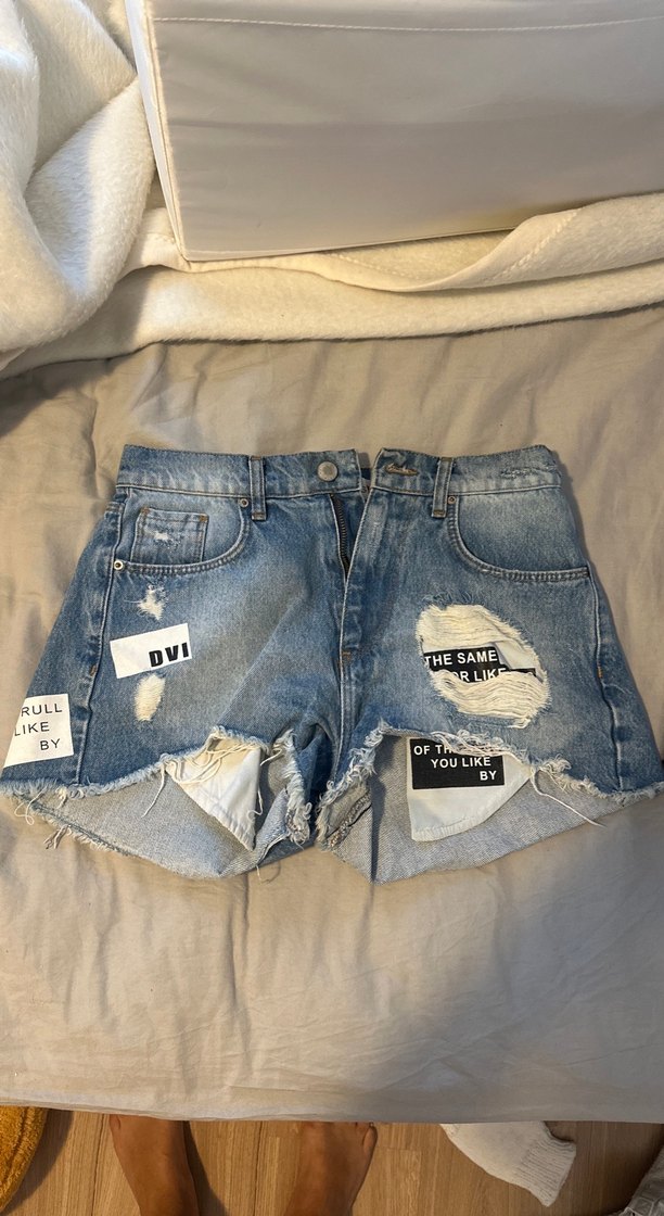 Baskılı yamalar ve yırtık detaylara sahip, kemerli gevşek kesim mini kot şort. Günlük sokak stili için uygun, grunge punk tarzında.