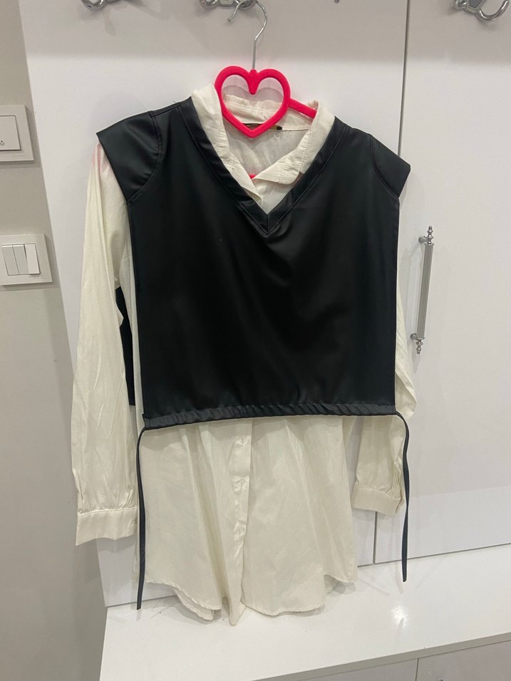 Beyaz yakalı, kollu midi gömlek ve siyah kemerli süveter içeren, gevşek kesim ve sokak modası tarzında kadın kıyafeti. Tesettürede uygundur açıklar için de uygundur .