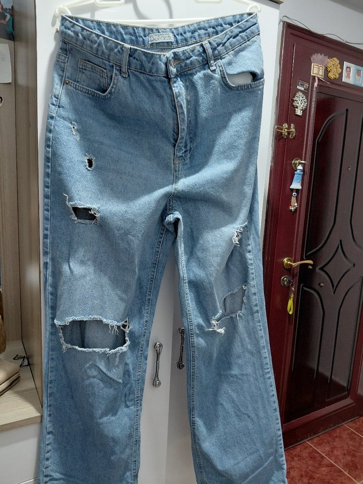 Yırtık detaylı, gevşek kesim midi boy mavi kot pantolon, günlük rahat kullanım için uygundur.
