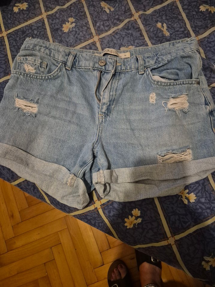 Gevşek kesim, tokalı detaylara sahip buz mavisi mini kot şort. Günlük kullanıma uygun, yırtık detaylı ve katlamalı paçalı sokak stili şort.