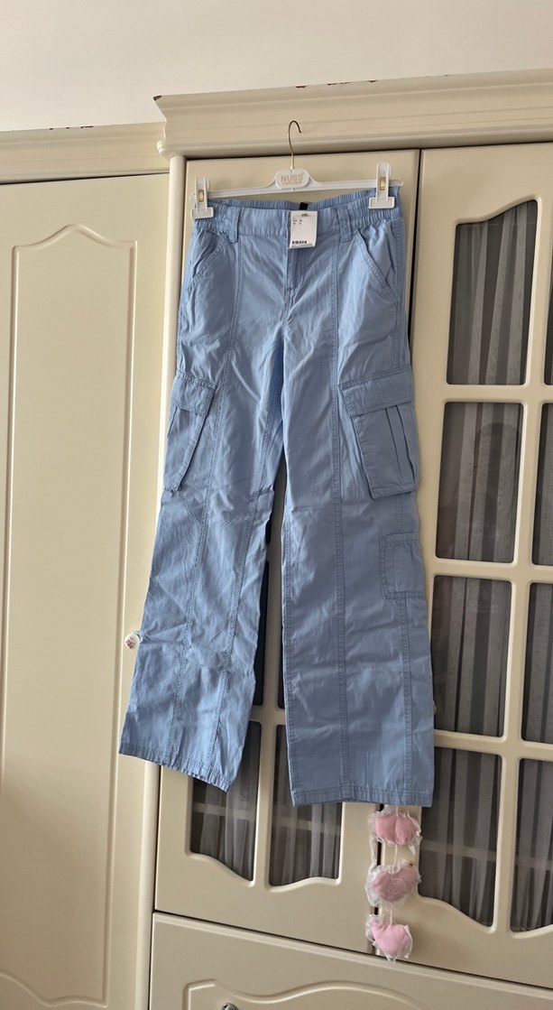 Gevşek kesim, kemerli, çok cepli gri-mavi kargo pantolon rahat dış mekan kullanımı için uygundursıfır etiketli ürün yazlık kumaştır.