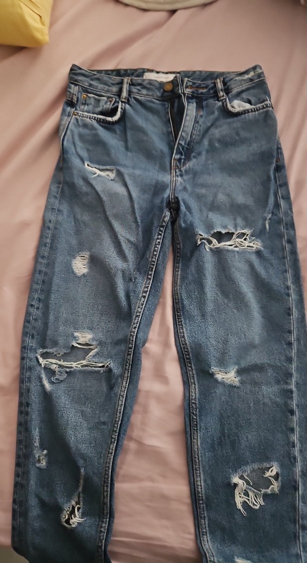 Gevşek kesim, tokalı detaylı, yırtık desenli kadın kot pantolon. Normal midi boyda, gri tonlu mavi renkte, günlük rahat kullanım için uygun.