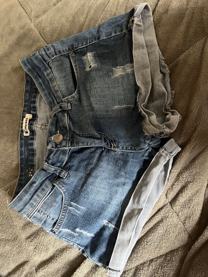 Gevşek kesim, mavi kot şort, gri tokalı detaylarla. Kısa boy ve desensiz, rahat sokak tarzı için uygun. Günlük kullanıma ideal.
