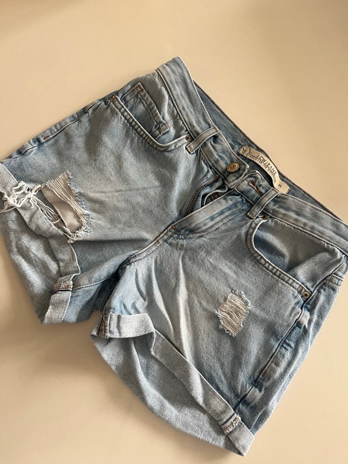 Gri renkli, gevşek kesim kot şort, kısa ve mini boyda. Tokalı detayları ve hafif yırtık görünümüyle günlük sokak stili için uygundur.