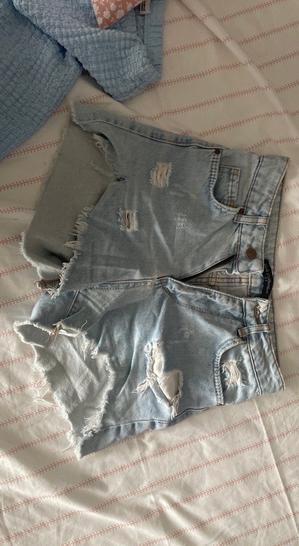 Gevşek kesim, yıpranmış detaylı, tokalı mavi kot kadın şort, rahat sokak stili için uygundur.