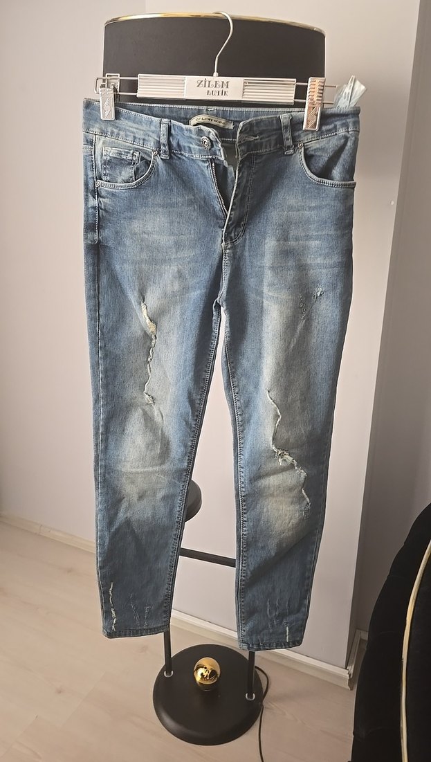 Gevşek kesim, midi boy, mavi denim kadın kot pantolon. Kemer tokası detayı ve hafif yıpranmış görünümüyle günlük sokak stili için uygundur.