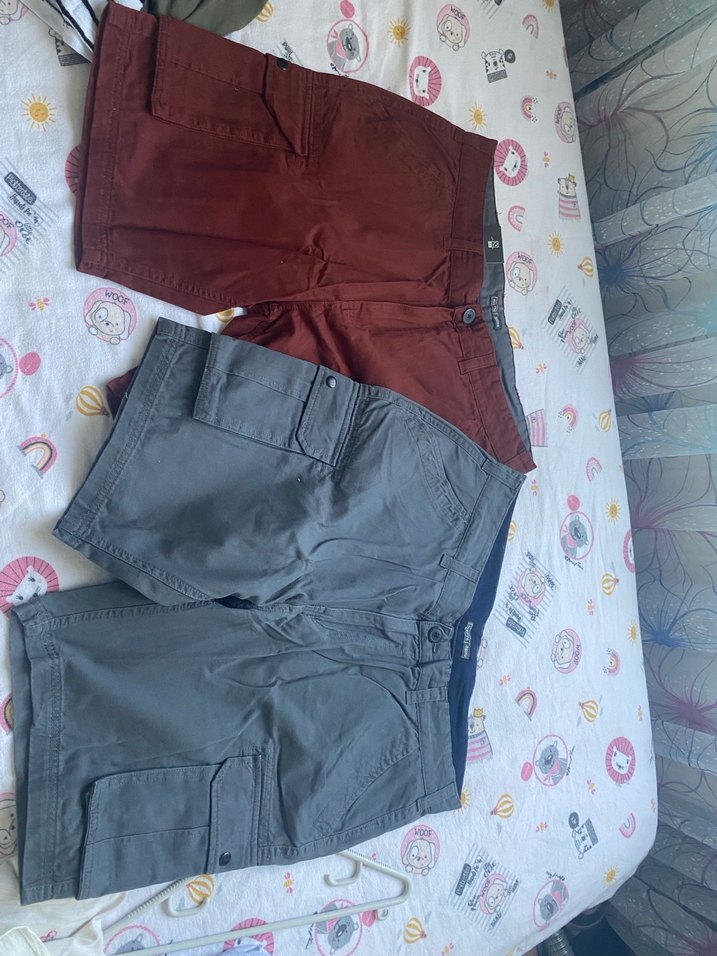 Kemerli, gevşek kesim erkek şortları, kahverengi ve gri renklerde, sentetik kumaştan yapılmıştır. Outdoor rahat tarz için uygundur.