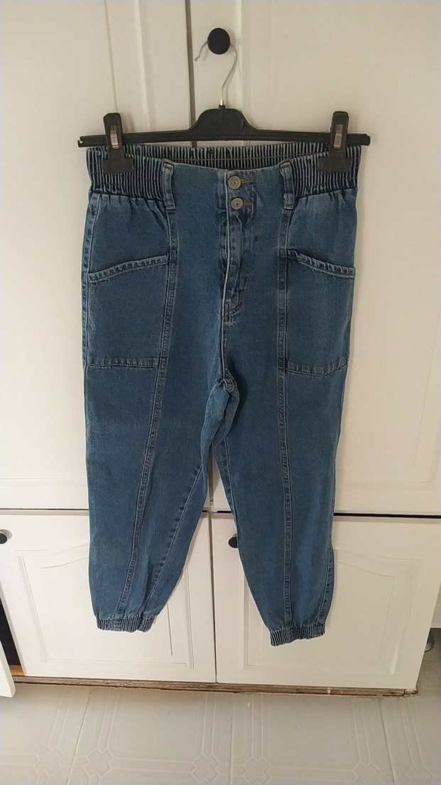 Gevşek kesim midi kot pantolon, kemerli ve lastikli paçalı. Büyük ön cepler ve düğmeli kapanışıyla günlük sokak tarzına uygun. addax alındı hiçbir sorunu yok 28 beden bel 34 boy 91