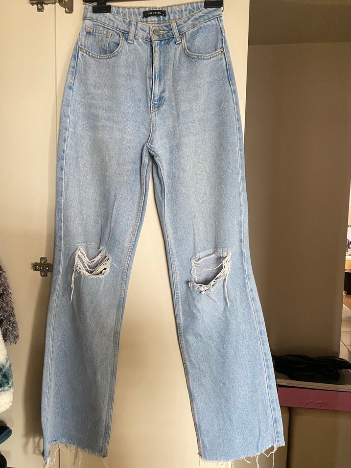 Gevşek kesim, boy kot pantolon, tokalı detay ve yırtık dizlere sahip. Gri-mavi tonlarında, günlük rahat kullanım için uygun.