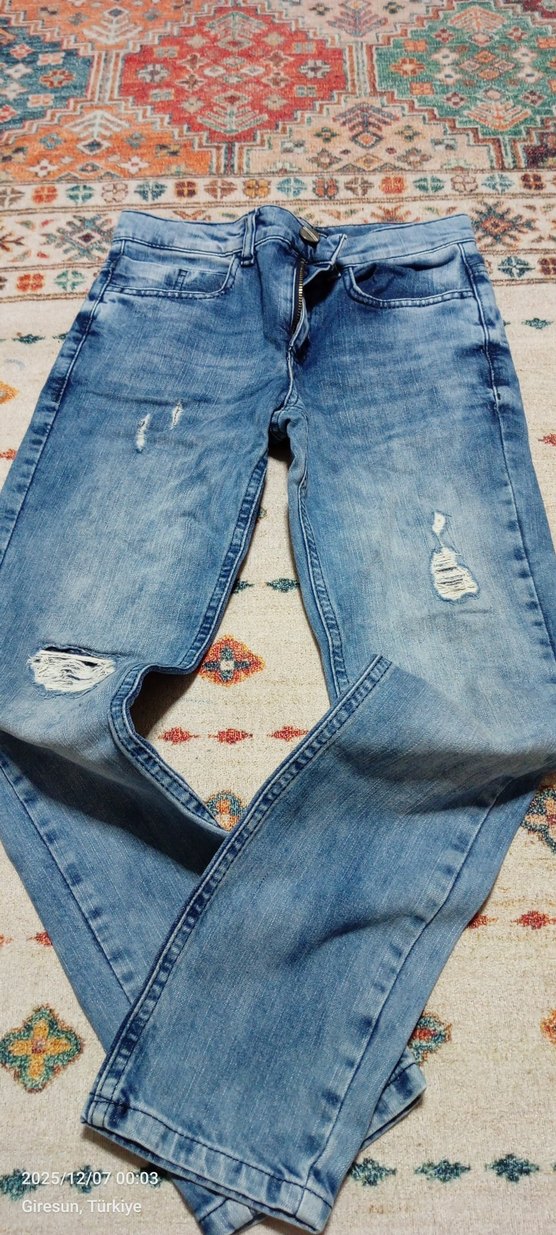 Gevşek kesim, tokalı mavi denim kot pantolon. Sokak tarzı ve hafif yıpratma detaylarıyla günlük kullanıma uygun.