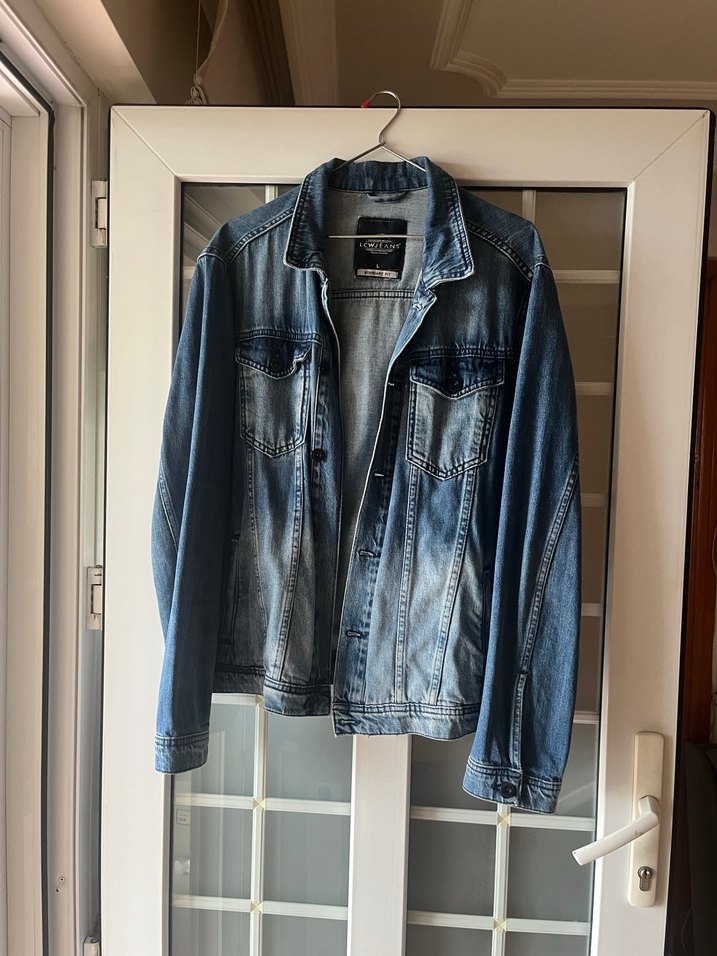 Gevşek kesim, uzun kollu mavi denim ceket, düğmeli ve notlu yaka detaylıdır. Günlük kullanıma uygun, sade ve rahat bir tarza sahiptir.