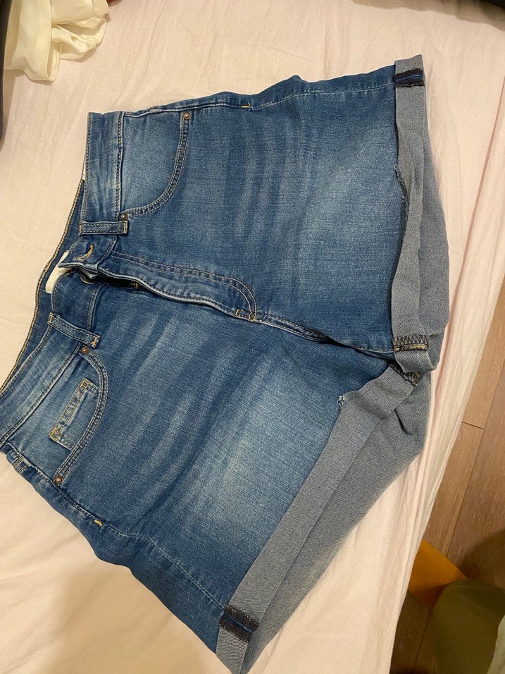 Gevşek kesim mavi denim midi şort, tokalı detaylarla günlük kullanıma uygun rahat sokak stili sunar. Normal boyda ve soluk gri tonludur.