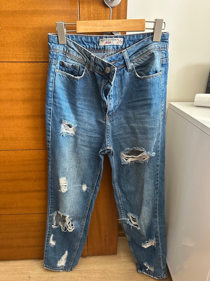 Gevşek kesim, mavi renkli kot pantolon, çok sayıda yırtık detay özelliklerle günlük sokak stili için uygundur.