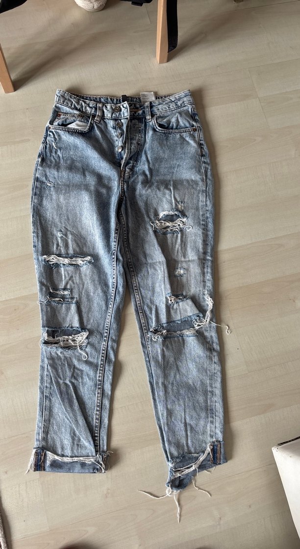 Bu mavi kot pantolonlar, gevşek kesim ve yırtık detaylara sahip olup, tokalı paçalarıyla günlük sokak modasına uygundur.
