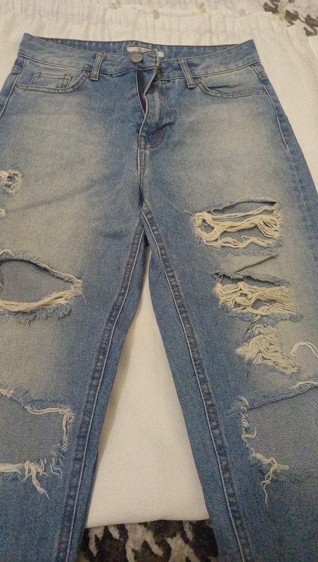 Gevşek kesim, mavi denim kot pantolon, tokalı ve yırtık detaylara sahip. Günlük kullanım ve sokak stiline uygun.
