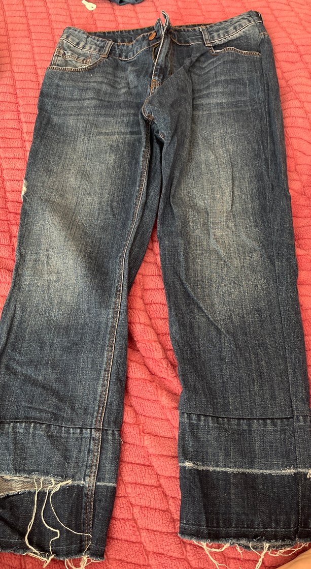 Mavi renkte, gevşek kesim midi boy kadın kot pantolon, tokalı detaylı, günlük rahat kullanım için uygundur.