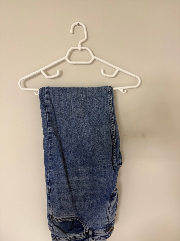 Gevşek kesim, midi boy mavi kot pantolon, tokalı detaylı, minimalist ve sokak stili, gündelik rahat kullanım için uygun.