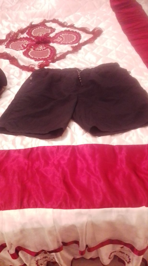 Gevşek kesim, drapeli midi uzunlukta, desen içermeyen koyu renk erkek mayo şortu. Günlük kullanıma uygun, cesur athleisure goth tarzında.