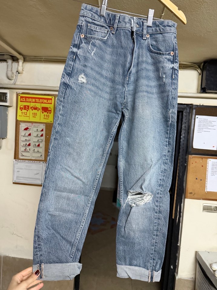 Mavi renk, gevşek kesim midi kot pantolon, tokalı detaylı. Günlük kullanıma uygun casual streetwear tarzı, yıpranmış görünümle. ️