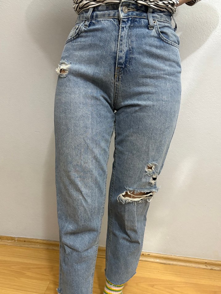 Gevşek kesim, kemerli midi kot pantolon. Hafif yırtık detayları ve mavi-gri tonu ile günlük sokak stiline uygun.