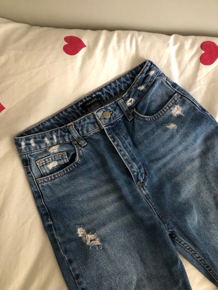 Gevşek kesim, midi boy kot pantolon, tokalı bel detayı ve soluk mavi-gri renkte. Günlük kullanıma uygun rahat sokak stili