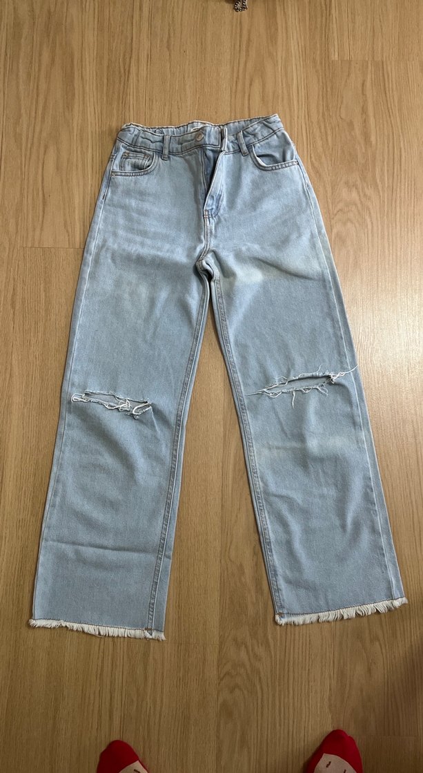 Gevşek kesim midi kot pantolon, yırtık detaylar ve püsküllü kenarlarla günlük kullanıma uygun. Açık pastel bej rengi sade bir dokunuş sağlar. 11 12 yaş