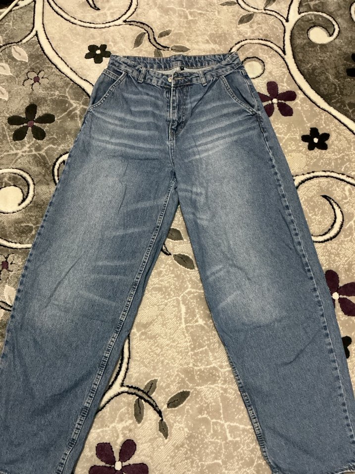 Gevşek kesim, midi boy kot pantolon, mavi denimden yapılmıştır. Rahat sokak stili ve bağlama boyası efekti ile günlük kullanıma uygundur.