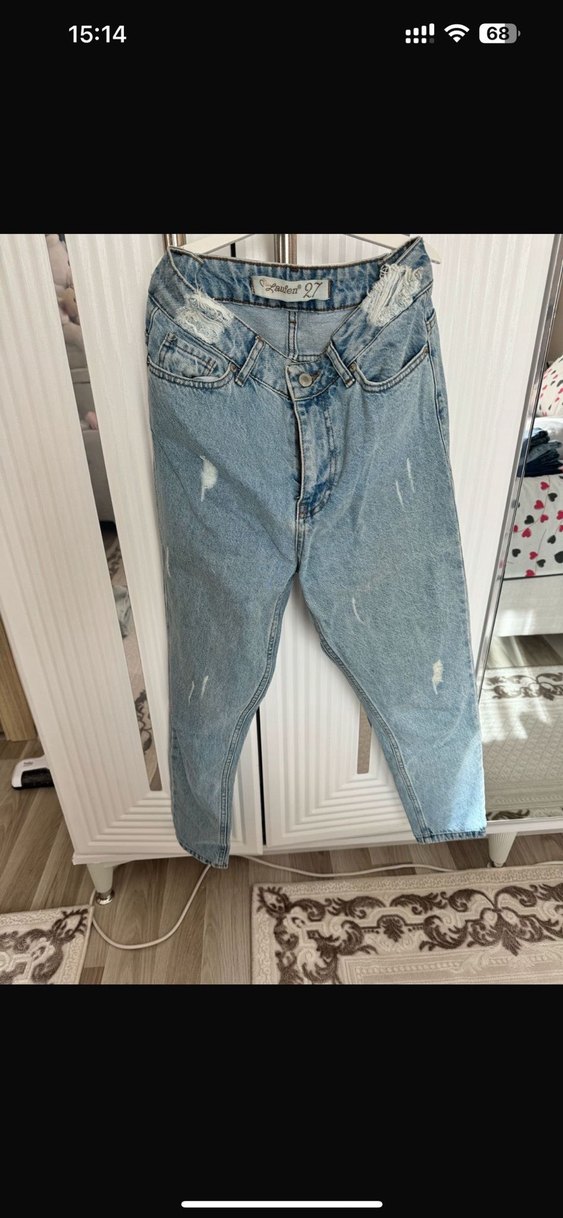 Mavi renkli, gevşek kesim midi kot pantolon, tokalı detay ve hafif yıpranmış görünüm ile günlük sokak tarzı için uygun.