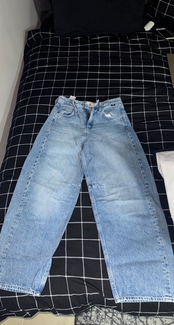 Gevşek kesim, midi boy mavi kot pantolon, tokalı detayıyla günlük sokak stili için uygun. Rahat ve salaş tasarım.